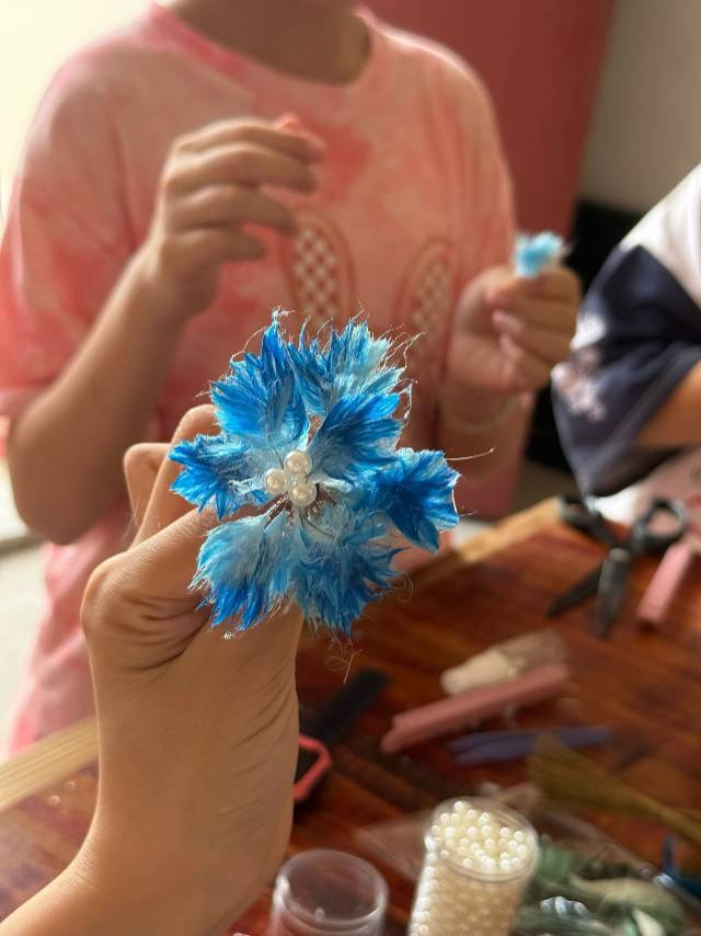9月1日,我和新如到蛋茶店做绒花,一开始把预期降得很低,就是我们俩自己玩玩,我也是第一次接触,想摸清楚整个操作环节,中途信玉奶奶、派妍阿姨、邹奶奶过来围观,我们希望她们能够上手,但多次引导无果
