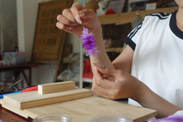 现实和想象总是有差距的,没想到我这个待了多年的老油子也没能“勾搭”到阿姨奶奶参与,不过在做的过程中我也发现绒花确实并没有想象中的那么简单,还是有很多比较精细的、需要耐心的步骤(第一步就是梳,要先把蚕丝线梳开,动作非常简单,但需要一定时间,第二步是固定细铁线,搓铁线的手法上也需要一定技巧,第三步是把绒剪下来、理齐、旋开,旋的过程中容易因为铁线没搓好返工或报废,第四步是熨平和精修,最后是组装。)